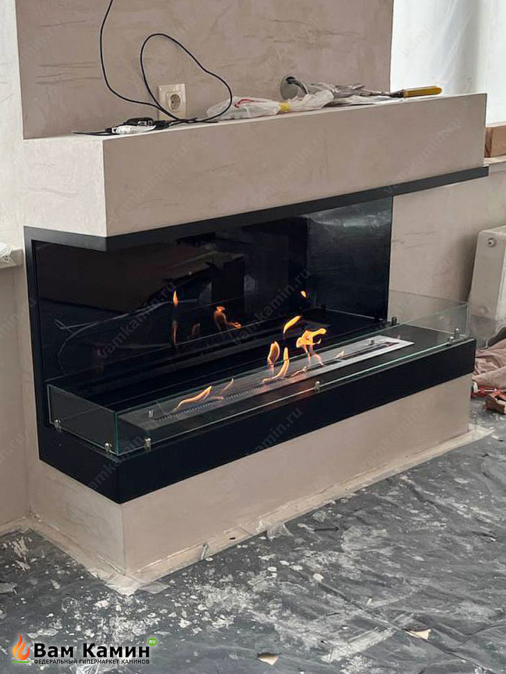 Такой экокамин создавался по индивидуальному заказу. В его основе лежит модель “биокамин фронтальный SteelHeat Leader 1300”. Только под нишу по желанию клиента были изменены габариты фронтального биокамина. Его общая длина равна 1320 мм, с величиной топливного блока в 1000 мм. Линия огня занимает 90 см, что позволяет считать такой биокамин хорошим дополнительным источником тепла.