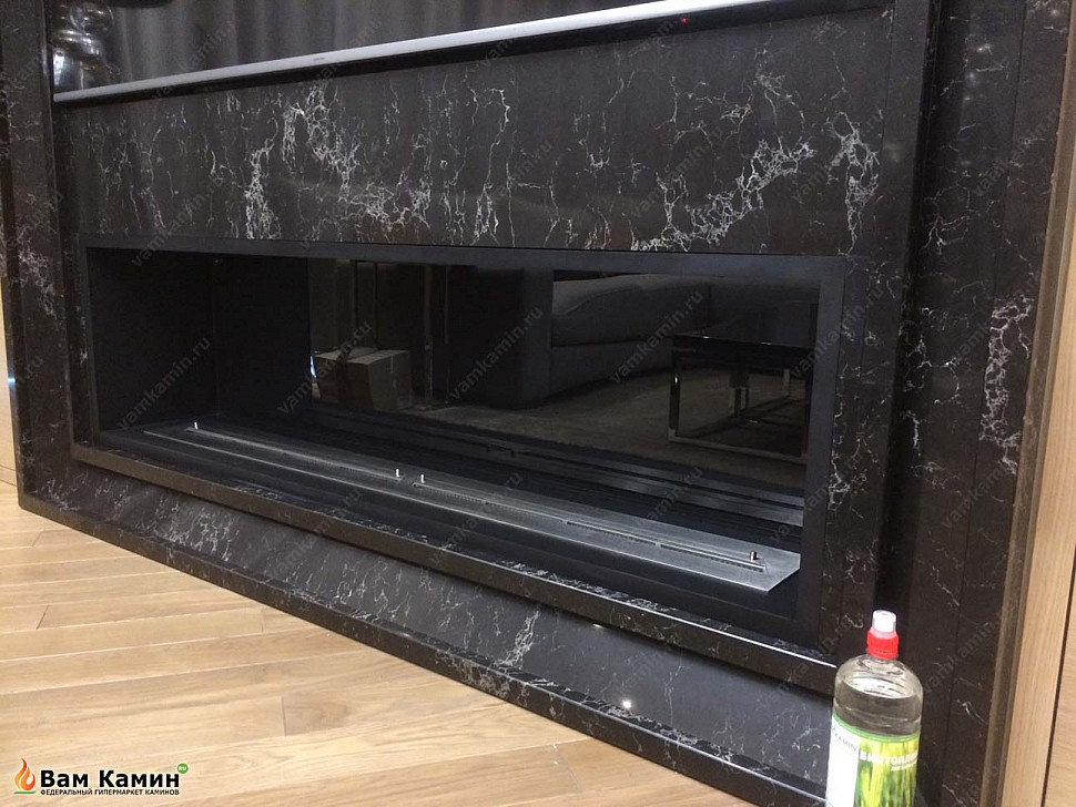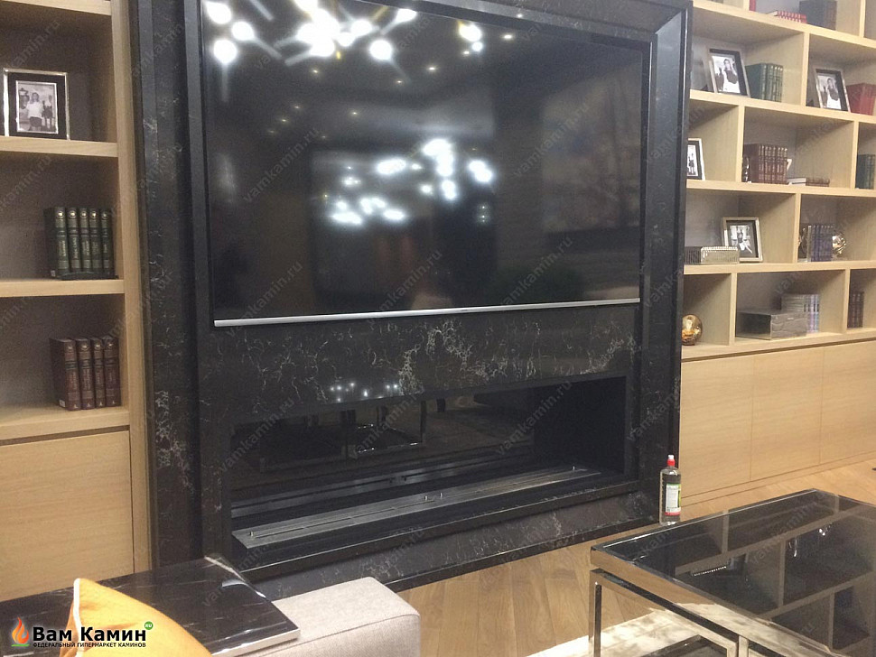 Биокамин в нишу SteelHeat LEADER 1600 изготавливался под заказ по размерам клиента. Благодаря точно подобранным размерам темный экокамин идеально вписался в нишу, образовав эффектный декоративный тандем с ТВ-панелью. Обрамление из благородного черного мрамора придало завершенности всей композиции. Благодаря такому продуманному дизайну биокамин в нише с TV-панелью смотрится солидно и стильно.