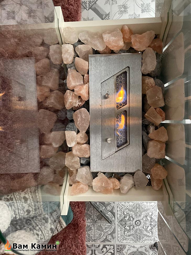 Топливный блок окружен декоративными керамическими камнями. Сам топливный блок по длине 340 мм с линией огня в 280 мм. Он изготовлен из шлифованной нержавеющей стали с жаропрочными характеристиками. Интенсивность пламени регулируют задвижкой, которую передвигают с помощью кочерги. Кочергу SteelHeat можно увидеть на первом фото.
