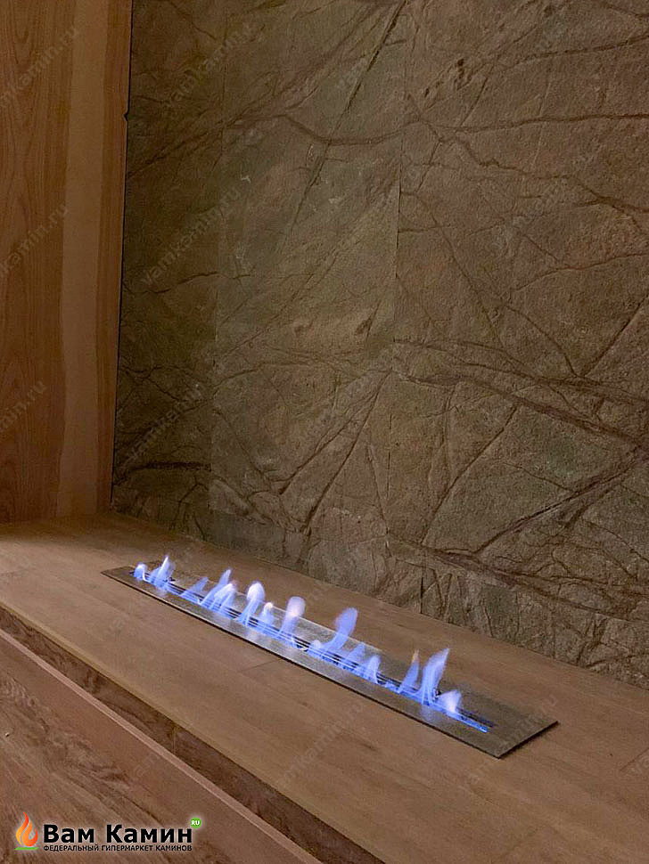 Одним из инновационных решений в интерьере стало встраивание топливного блока биокамина в предметы мебели и облицовки. На фото топливный блок IN-LINE 1000 прекрасно сочетается с мраморной облицовкой стены и плиткой под дерево на полу. Такой дизайнерский минимализм отвечает последним трендам. Плюс топливная горелка никак не нагружает интерьер и выглядит стильно и аутентично.