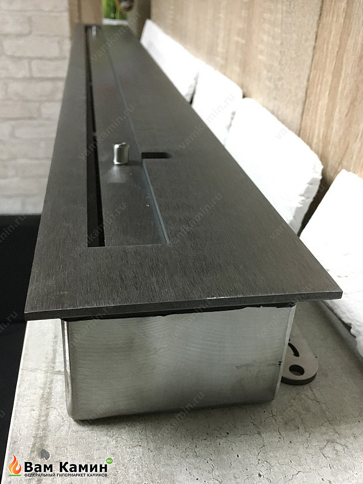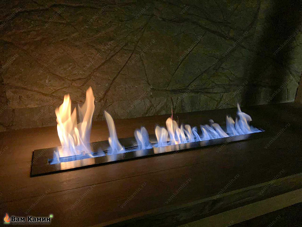Линия огня в 900 мм выступает как дополнительный источник тепла для всего помещения. Как можно увидеть по фото при выключенном свете такой минималистичный биокамин для дома смотрится особенно интересно. Языки пламени навевают романтическую атмосферу и дарят позитивные эмоции.
